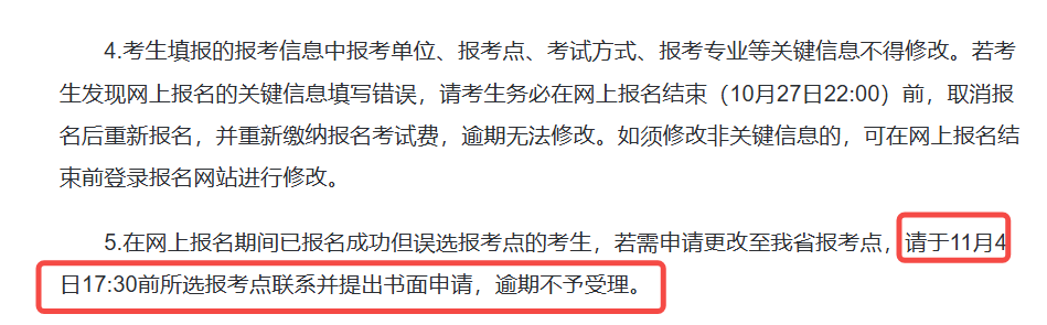 申请更改至福建省考点的考生,须在11月4日17:30前向所选报考点联系并提出书面申请,逾期不予受理。