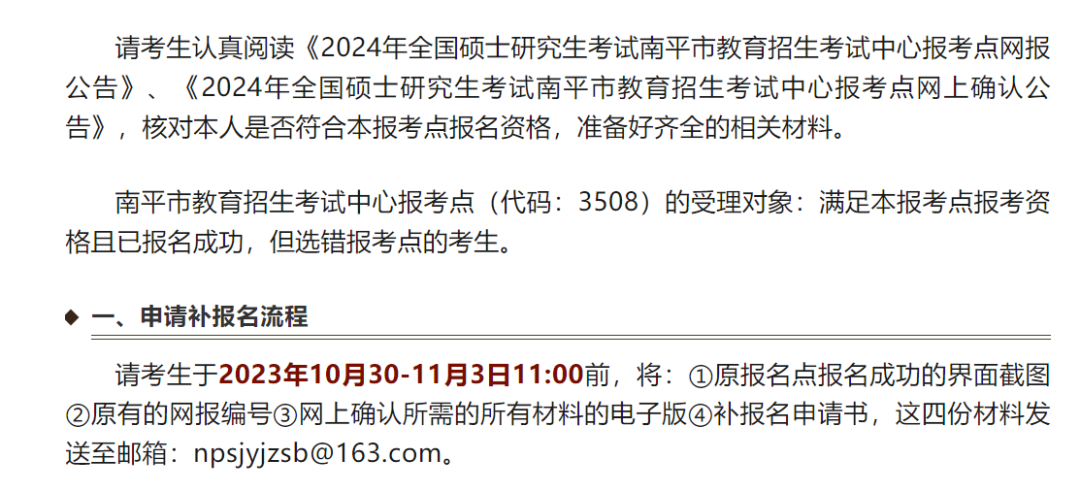 由于福建省教育考试院并没有公布具体的流程和书面申请格式,所以结合了去年南平市教育局给出考研补报名的相关信息为考生们整理了具体流程,大家可以作为参考。