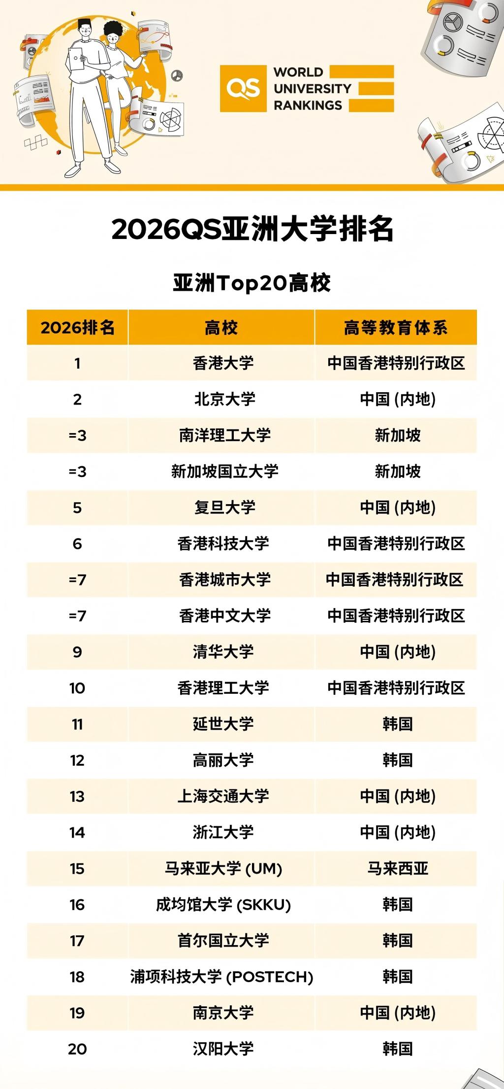 QS发布的2026亚洲大学排名中,中国、韩国、新加坡高校表现依旧强势,而亚洲高校TOP20中,更是有11所中国高校。