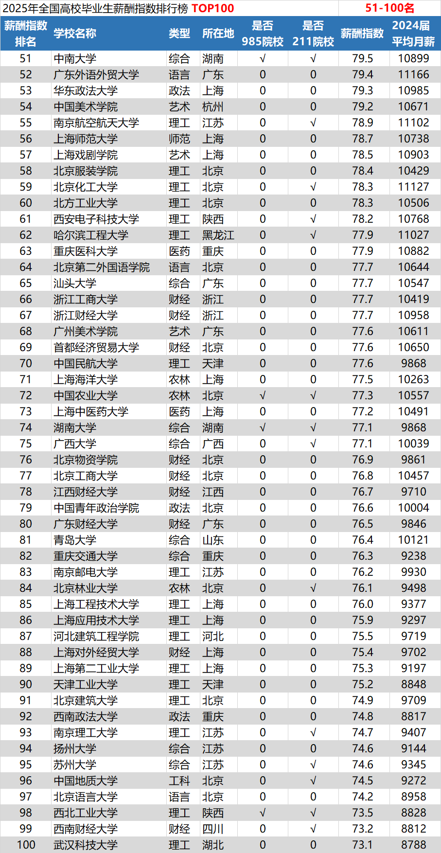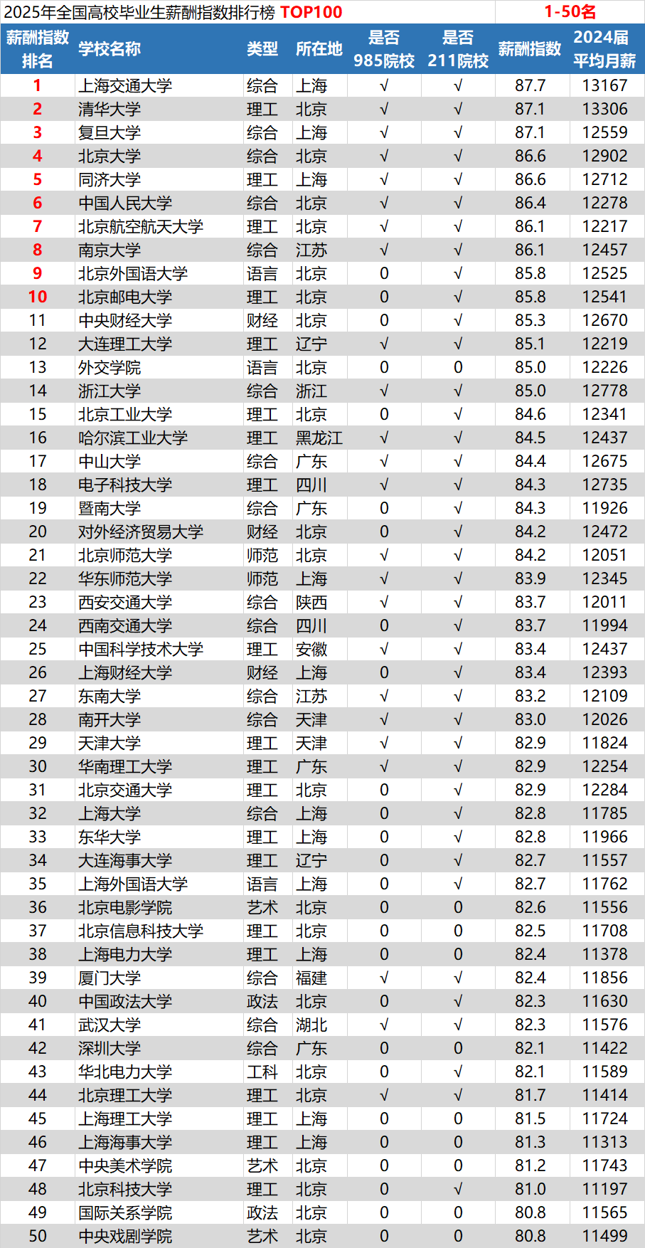 而在今年九月份中国薪酬网发布的《2025年全国高校毕业生薪酬指数排行榜TOP100》中,榜单显示,上海交通大学、清华大学、复旦大学位列前三,北京大学、同济大学、中国人民大学紧随其后。