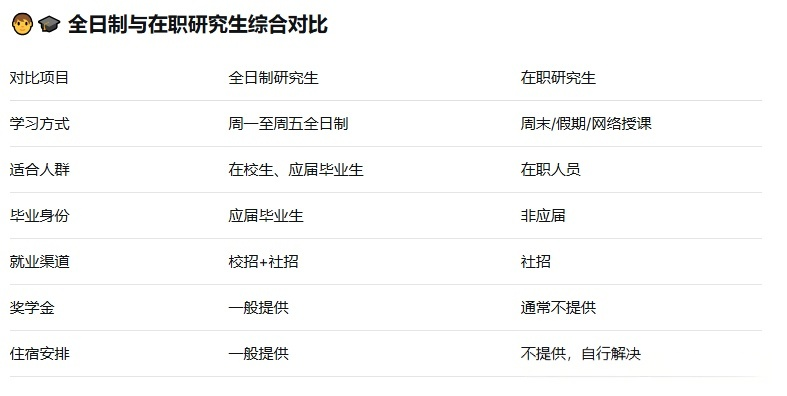 从整体来看,全日制研究生与在职研究生在学习方式、适合人群和毕业身份等方面有明显区别。