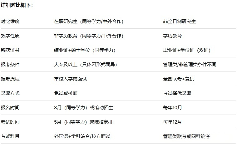 理清基本概念后,很多同学还想了解在职研究生与全日制研究生的具体差异、学习流程及适合人群。