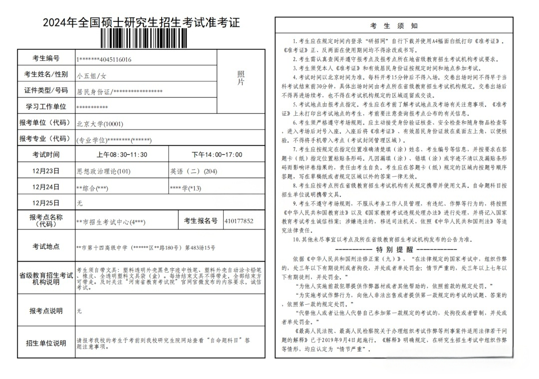准考证的样式如下,A4纸横版打印,左侧是考生考试信息,右侧是考生须知。黑白即可。