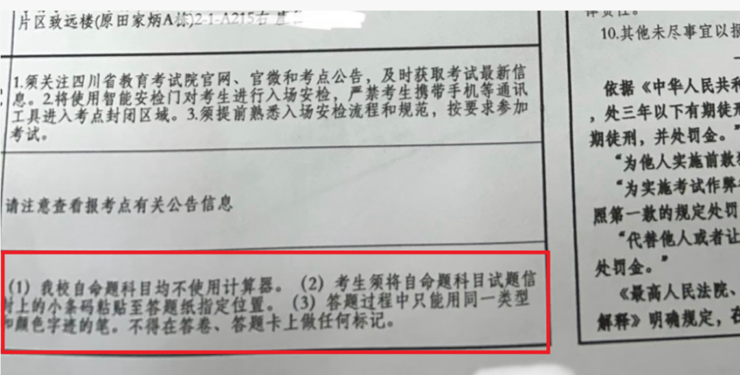 不论是考前还是考试中,千万不要把准考证当草稿纸使用,更不要把答案写在上面想着出来对答案,被监考老师发现可能会直接把你判作弊,因为你说不清是在考试前就写上去的还是考试时写上去的。有同学说那可以去调监控呀,是,但这样很耽误时间且影响答题心情影响考试,不要抱有侥幸心理,给自己找麻烦!切不要以身试法!