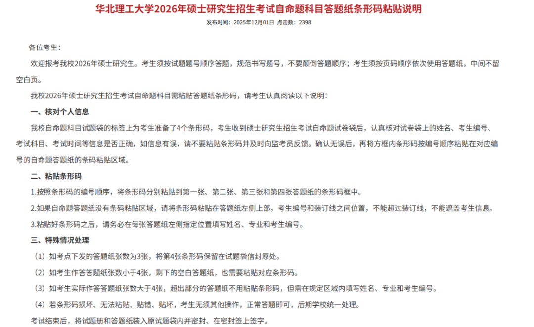 华北理工大学发布了2026年硕士研究生招生考试自命题科目答题纸条形码粘贴说明。