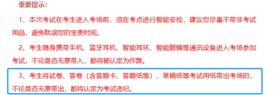 离开考场之前检查一下是否不小心夹带了草稿纸、答题卡等,带走会被视为违规。