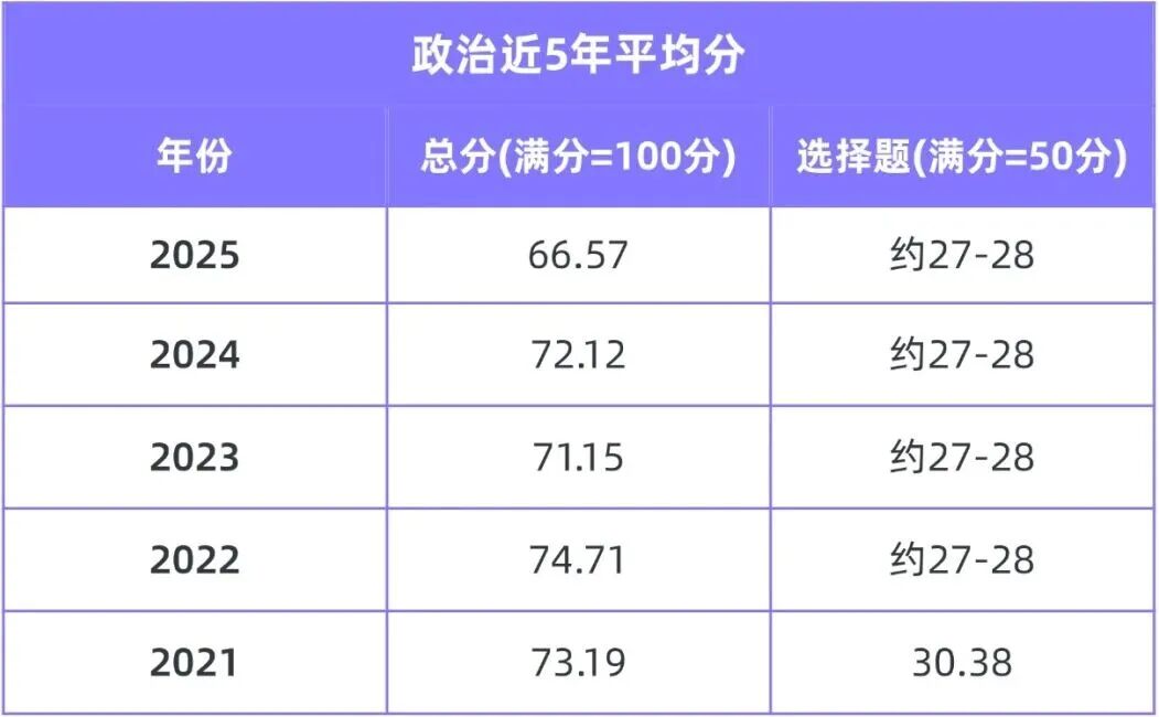 根据往年的数据,政治平均分基本在70-75分之间,难度系数属于中度难度,比较稳定,并不会出现剧烈的难度变化。
