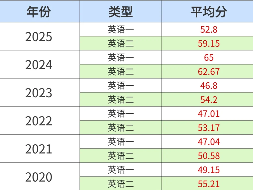 我们可以明显发现,25年的英语一和英语二难度都是一骑绝尘的,比24年低了有10几分,堪称断崖式下跌。