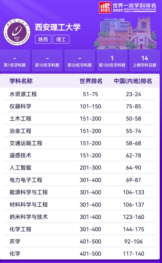 西安理工大学在学科建设方面成果显著:水资源工程专业名列前茅、仪器科学、土木工程等专业实力强劲。在工科专业上,西理可谓是遥遥领先!
