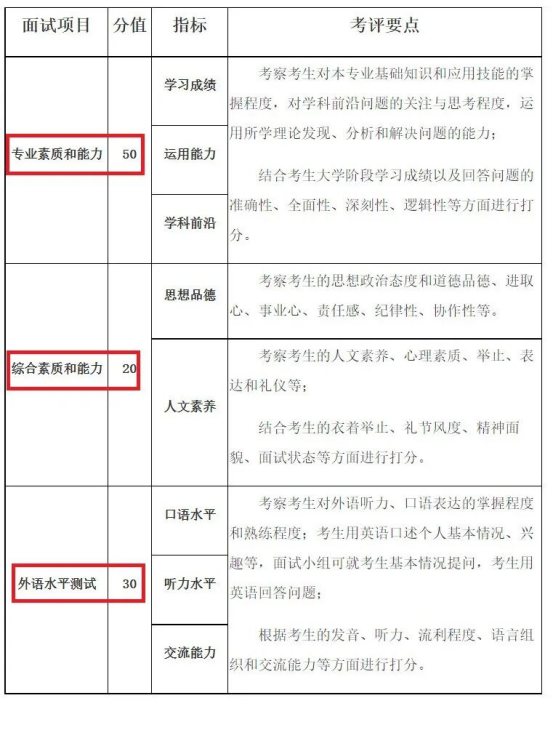 评分分综合面试和外语测试,核心是专业素质能力(考察基础、分析问题、科研、创新能力及培养潜力)。