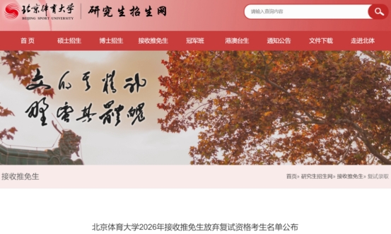 据官网公布,共1420名考生进入北京体育大学2026年接收推免生复试,此次放弃复试资格的同学占比约14.86%。