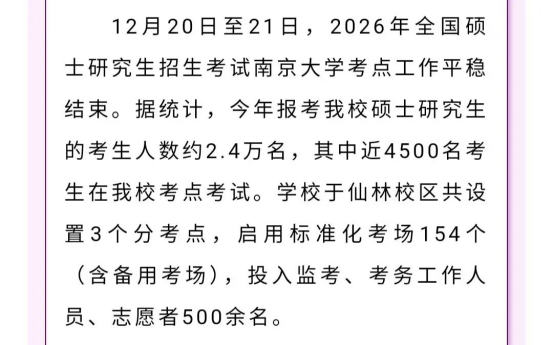 今年共有约2.4万名考生报考南京大学硕士研究生。