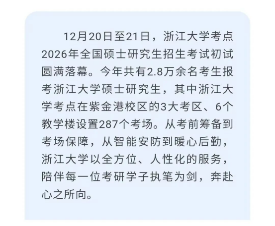 今年共有2.8万余名考生报考浙江大学硕士研究生。
