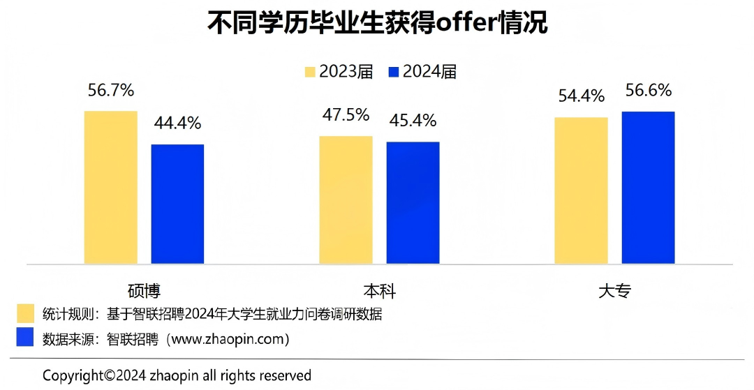 当下研究生就业竞争日趋激烈,学历内卷加剧,求职稳定性成为毕业生核心诉求。相关就业报告显示,2024年硕博应届生offer获取率仅44.4%,较上年大幅下降,甚至低于本科生水平,近五成研究生面临毕业即失业的困境。