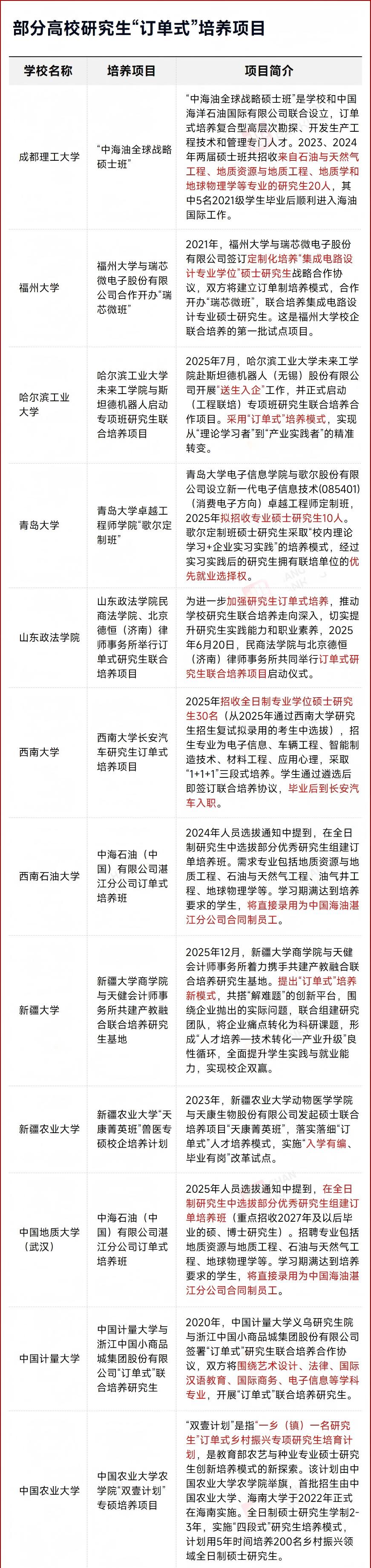 近年来,国内众多高校与大型国企、优质企业深化合作,批量开设研究生订单班,构建起“高校育人+企业用人”的闭环模式,覆盖能源、汽车、农业、商贸等多个领域。