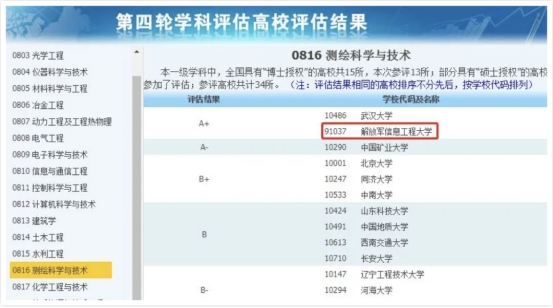 工学门类8个一级学科参加全国第四轮学科评估,测绘科学与技术获评A+,信息与通信工程、计算机科学与技术获评A-,总评成绩位居军队院校前列。