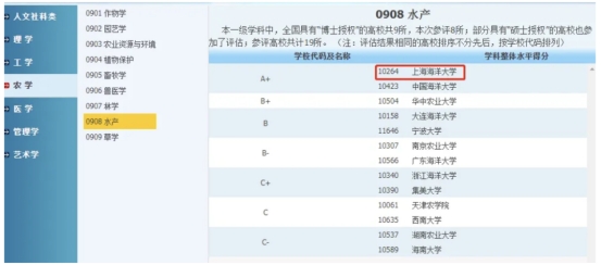 上海海洋大学水产学科2017年、2022年连续入围国家世界一流学科建设行列,并在教育部第四、五轮学科评估中获得A+评级。