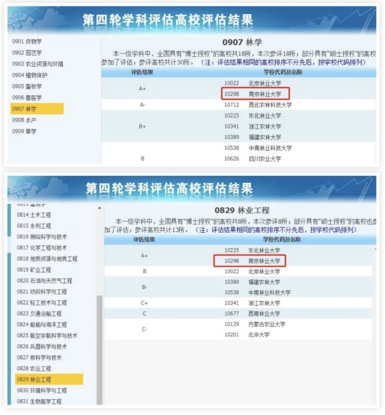 在第四轮学科评估中,林业工程、林学2个学科获评A+,风景园林学获评A-,A类学科数位列全国林业高校和江苏省属高校第一。