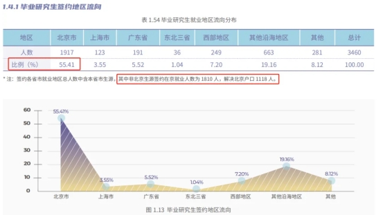 在就业市场上,北交大在北京地区的就业认可度非常高,55.4%的研究生签约于北京,且在北京就业超过一半的人解决了北京户口。就业单位也多为500强公司。