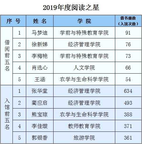 依据图书馆借阅系统统计,2019年全年借阅图书最多、入馆次数最多的前5名同学授予“阅读之星”荣誉称号。