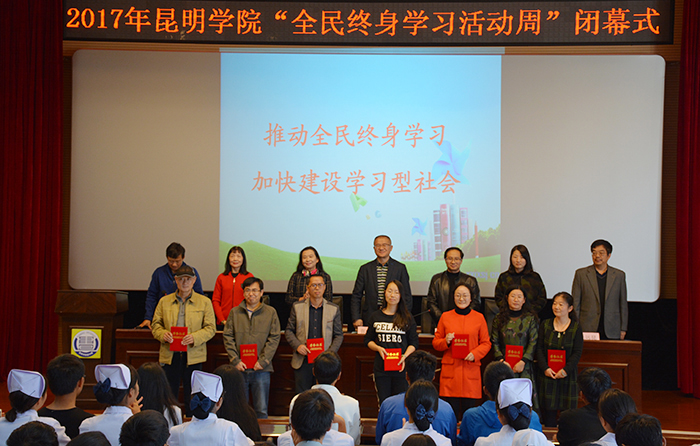 闭幕式上杨岚副主席作了活动周总结讲话,李海雁馆长宣读了《关于对2017年昆明学院全民终身学习活动周中“学习之星”“诵读之星”获得者进行表彰的决定》,与会领导为获得“学习之星”和“诵读之星”称号的师生代表进行了颁奖。