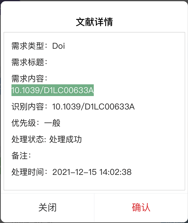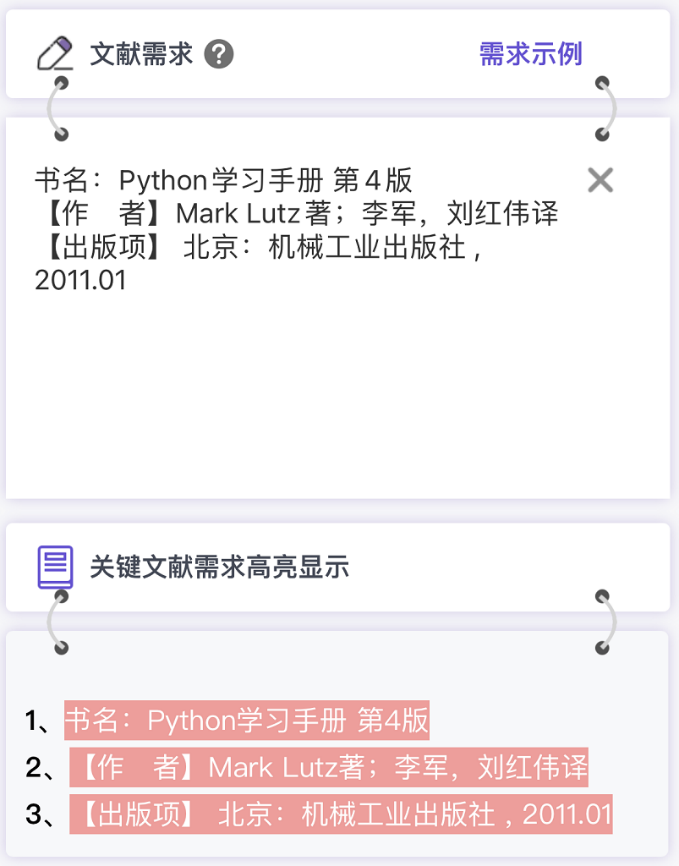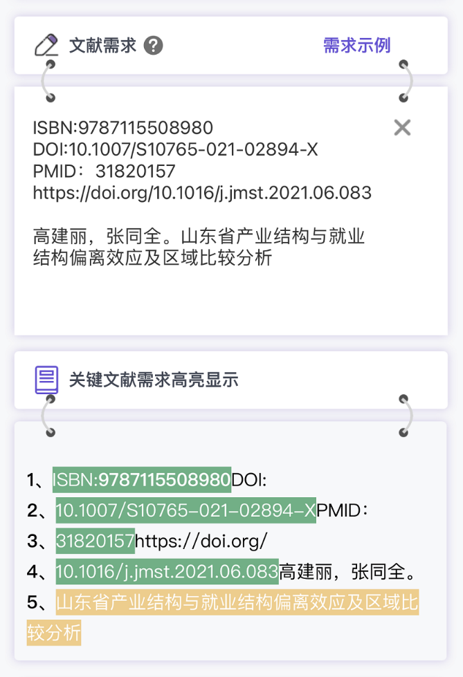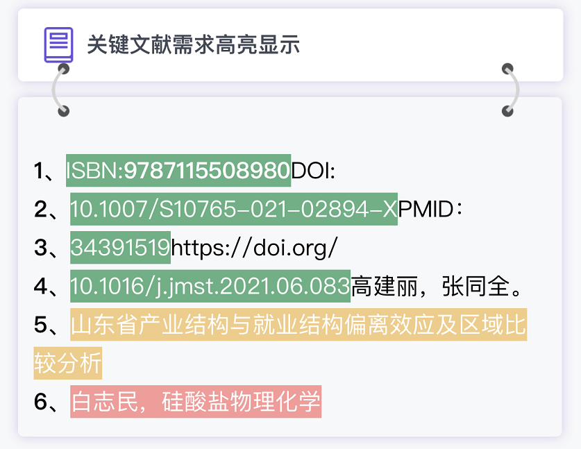 识别提取到文献信息为可以锁定唯一结果信息时显示绿色高亮。如DOI、PMID、ISBN、网址等