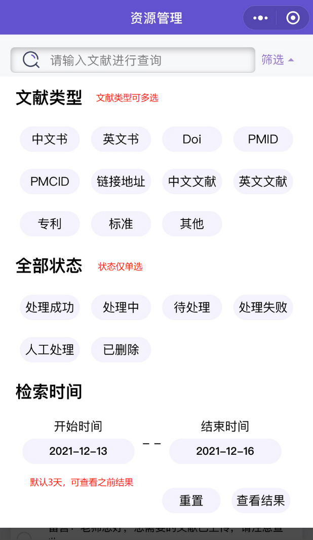 可对索要文献按文献类型、状态进行筛选